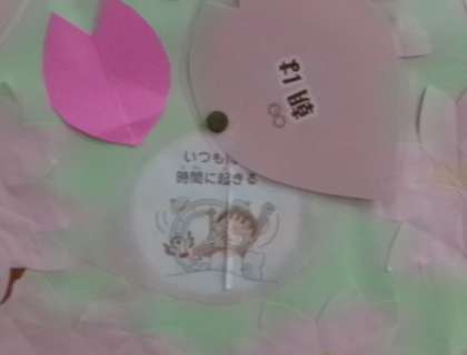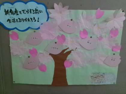 保健室前の掲示「新年度をむかえる前に、生活をふりかえろう」です。葉っぱをずらすと、メッセージが出てきます。