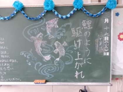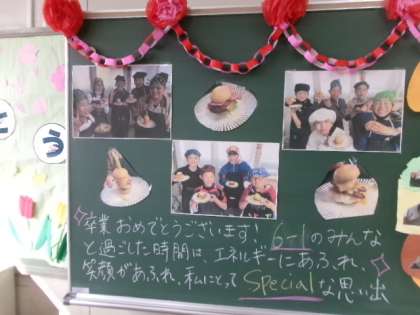 黒板には、級訓、お祝いの言葉や絵、担任からのメッセージなどが書き込まれていました。