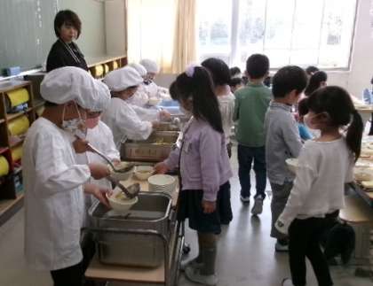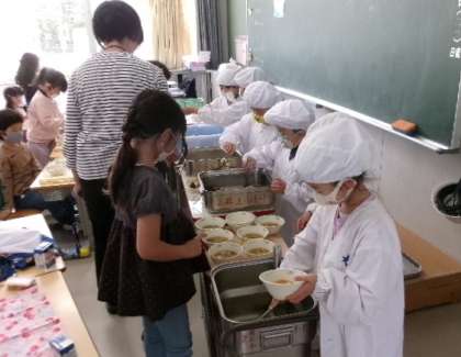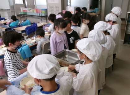 1年生の給食当番、それぞれの役割をしっかりと果たして頑張っています。「自分のことは自分で」できる小学生になってきていますね。