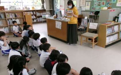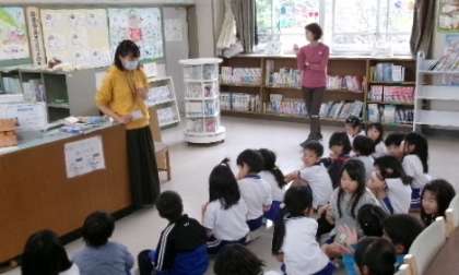 2年生が図書室で学校図書館司書さんの授業を受けていました。「本は心の栄養」です。たくさんの本に親しみましょうね。