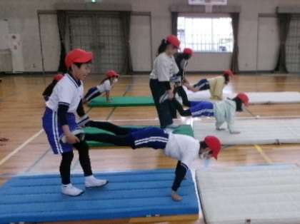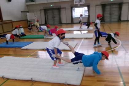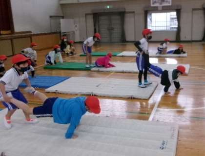4月24日(木)第1校時体育館での4年生体の様子です。校歌の歌詞にもある「体鍛える私たち」ですね。
