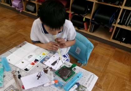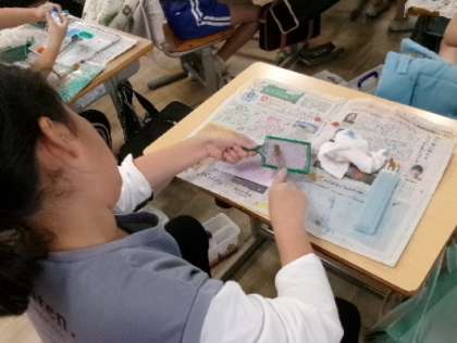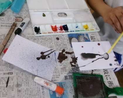 第1・2校時4年生が、「デカルコマニー・ドリッピング・スパッタリング・ふきながし」といった4種類の絵具の技法を学んでいました。