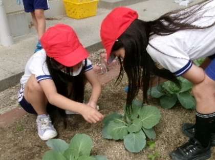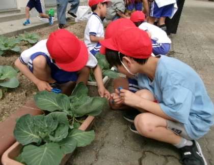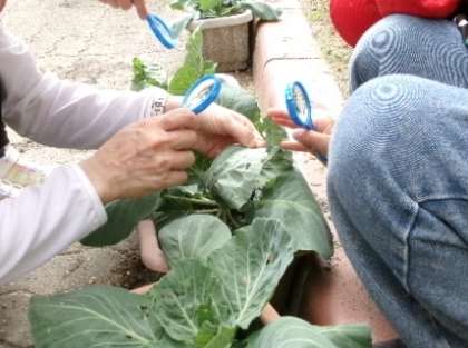 3年生がキャベツの葉の裏を、虫眼鏡でじっくりと観察していました。何かの卵が見つかりましたか?