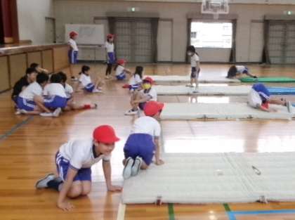4年生が体育館でマット運動の復習をしていました。前転や後転、開脚前転など、きれいにできましたか。