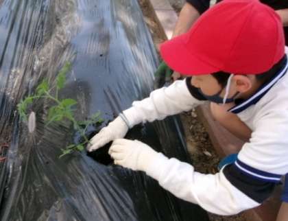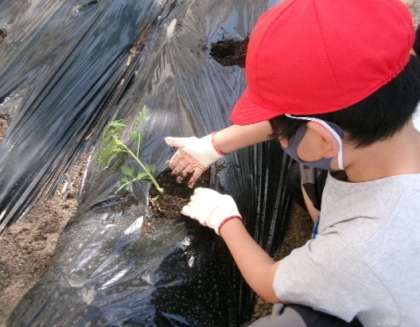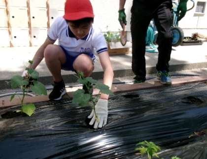 78組高学年が職員室前花壇で、キューリやナスなどの苗植えをしていました。78ストアーで新鮮な野菜を、楽しみにしていますね。