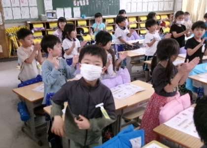 1年生「おんがくにあわせて からだをうごかそう」です。「さんぽ」の曲に合わせて手拍子をしていました。