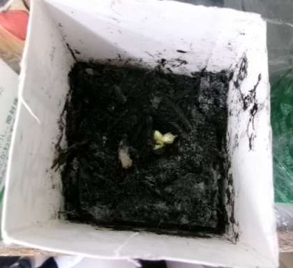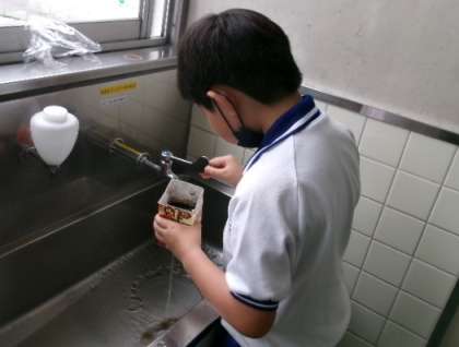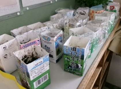 朝4年生が、ツルレイシ(ゴーヤー)の苗に水をあげていました。大きく育ちますように。