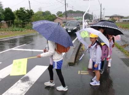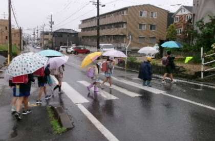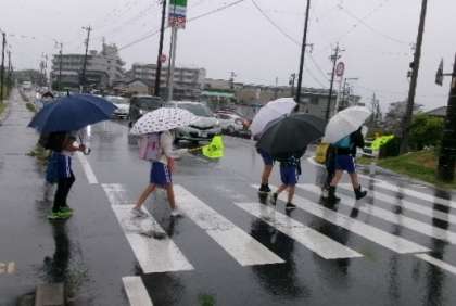 5月27日(月)朝から雨のため、傘さし1列登校でした。班長は黄色い旗で、注意喚起をしています。