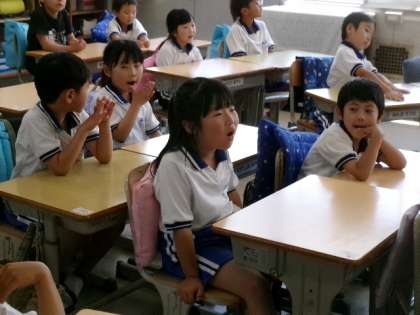 第3校時1年生が教室で、英語による絵本の読み聞かせを聞いていました。よくわかったかな?
