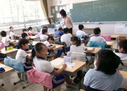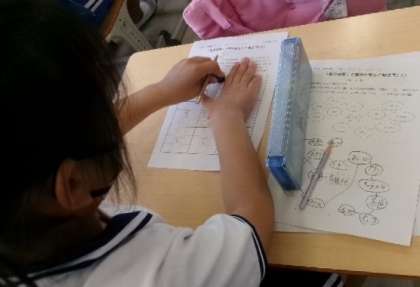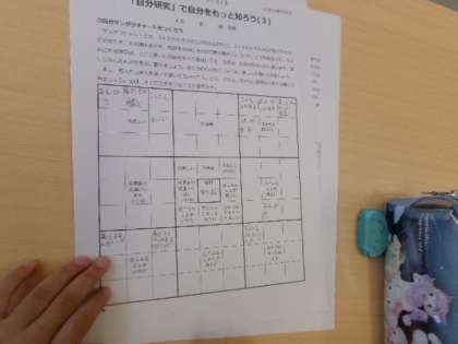4年生がキャリア教育「自分研究」で自分をもっと知ろうの授業をしていました。大谷選手で有名なあれを使っていますね。