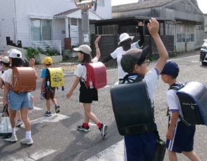 交差点などでは、それぞれ自分の目で、車が来ていないかなどの安全を確かめましょう。