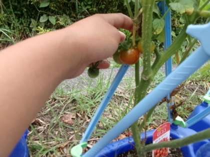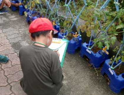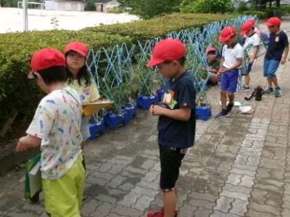 2年生がミニトマトの観察をしていました。おいしそうな赤い実がなりだしましたね。