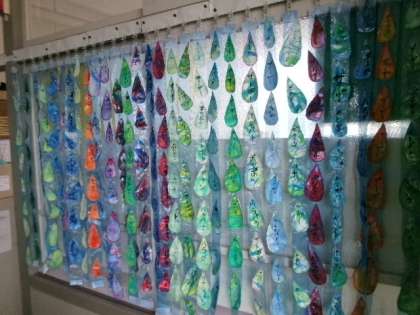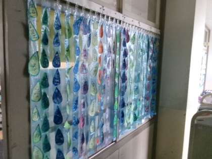 2年生教室前廊下に、雨のしずくが掲示されています。とってもきれいでユニークですね。