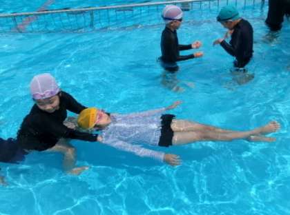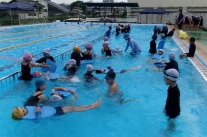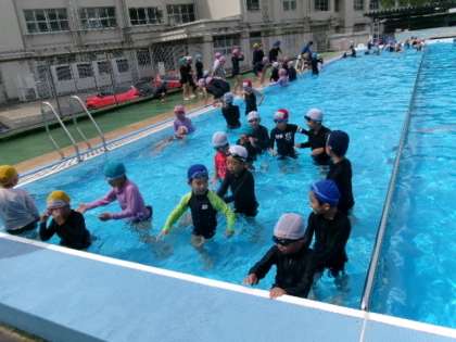 2年生の水泳の様子です。だいぶ水に慣れましたね。うまく浮けるようになりましたか?