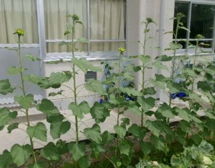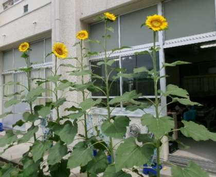 ひまわりがすくすく伸びて花を咲かせています。アサガオはちょっと葉っぱがへろへろです。きっと復活しますよね。