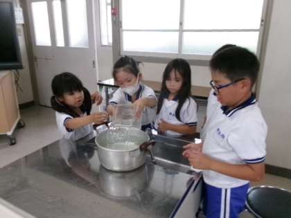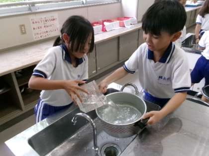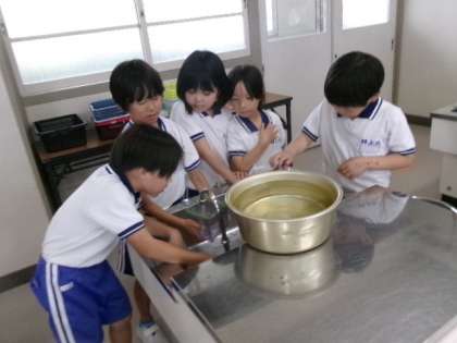 家庭科室で2年生が、1リットルマスで、かさの学習をしている様子です。