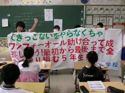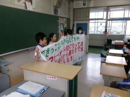 5年生がキャンプの横断幕を作成しました。「がんばるぞー!オー!」