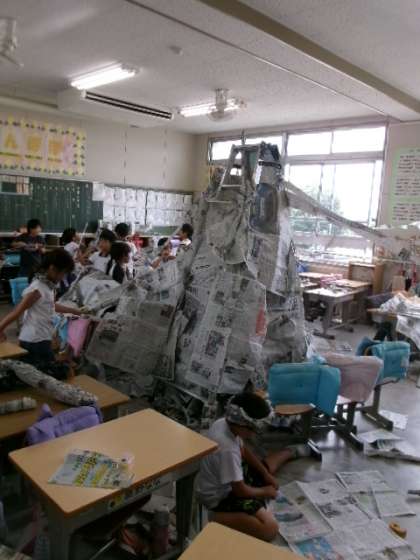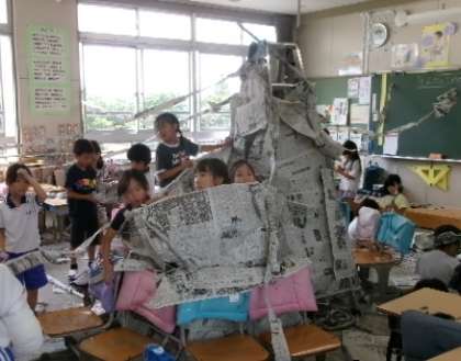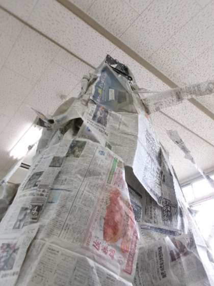2年生図工「しんぶんしとなかよし」です。新聞紙で大きな塔などをつくっていました。秘密基地のようですね。