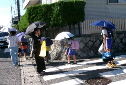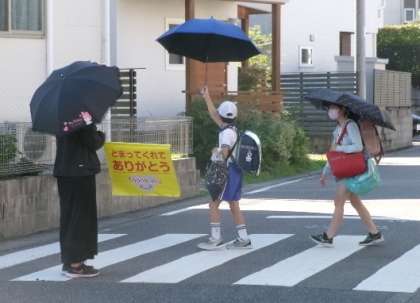 7月18日(木)井上町方面の傘さし登校の様子です。
