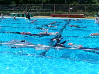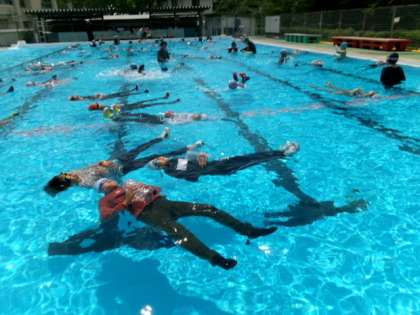 大きく息を吸って自分の肺を浮き袋にして、2リットルのペットボトルを上手に持って、しっかりと浮いていますね。