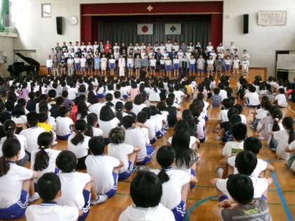 夏休み前全校朝会です。6年生の歌の発表がありました。
