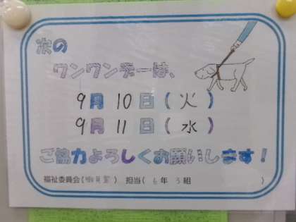 9月4日(水)朝の会で、福祉委員が各教室に出向き、ワンワンデー(盲導犬募金活動)の告知をしました。9月のワンワンデーは来週の10日(火)と11日(水)です。アルミ缶回収と募金へのご協力をよろしくお願いします。