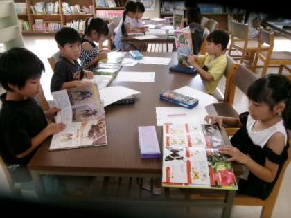 1年生が図書室の図鑑で、虫の飼い方などを調べていました。いろんな種類の虫がいるんですね。