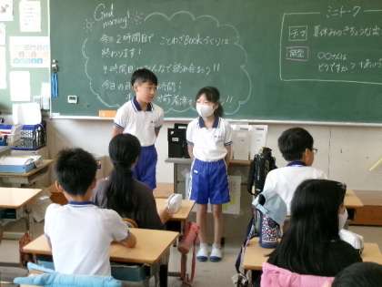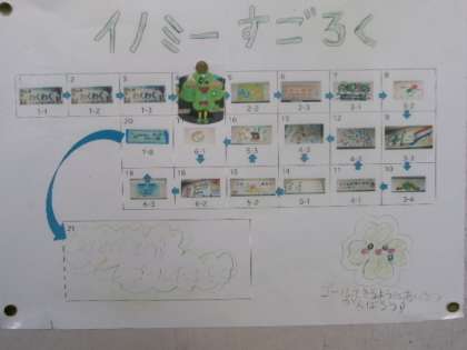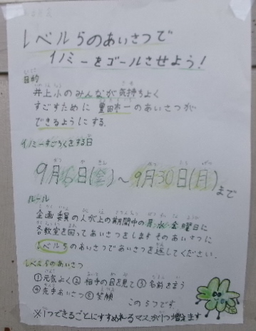 1元気よく2相手の目を見て3名前を言う4先手あいさつ5笑顔で、の5つできればレベル5です。企画委員が月水金の朝、各教室を回ってあいさつします。イノミーがすごろくで進んでいくアイディアが、とても楽しくていいですね。