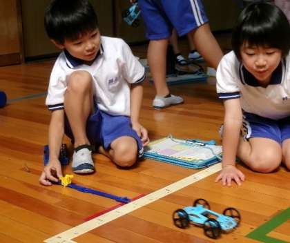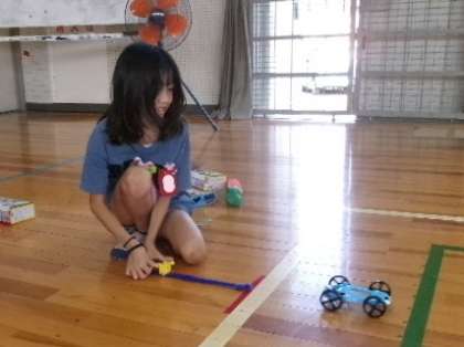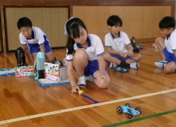 3年生が体育館で「ゴムの力」の実験をしていました。結果は予想通りでしたか。
