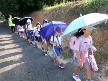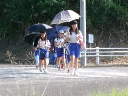 9月9日(月)御船町方面の登校の様子です。まだまだ当分の間、傘さし登校を続けます。