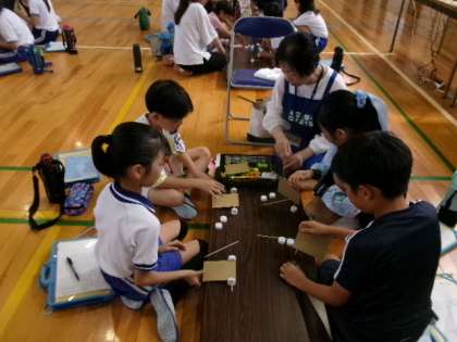 第2〜4校時体育館で3年生が、ものづくりサポーターの方々による出前授業を受けました。