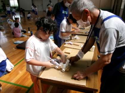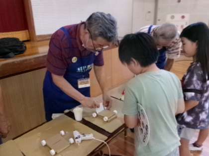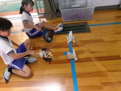 3年生の各自が風で動く車を工夫して作り、団扇で仰いで走らせました。たくさんの講師の皆さん、楽しい活動をありがとうございました。