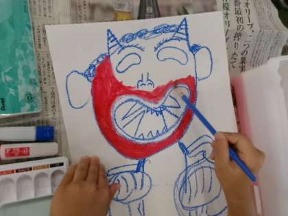 別のクラスでは、たくさんの「おに」を描き始めていました。完成がとても楽しみです。
