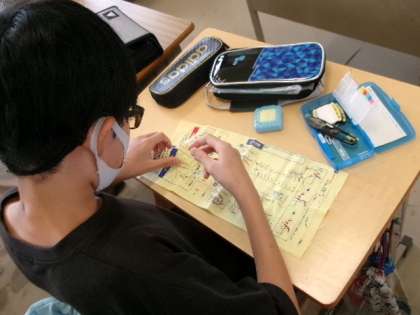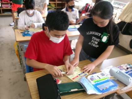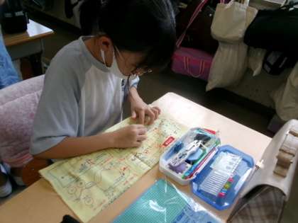 5年生が家庭科で、本返しぬいや半返しぬいを学んでいました。手先が器用になりますね。