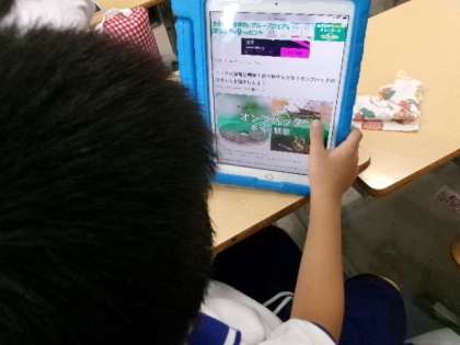 1年生がひらがなが書けるようになり、タブレットを使って虫の飼い方を調べていました。図鑑も使って調べていましたね。漢字が難しいですね。