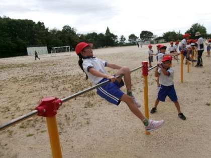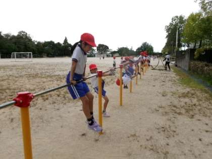 2年生の鉄棒です。上手に何回も連続で「足かけ後ろ回り」ができる子もいました。すごいですね。