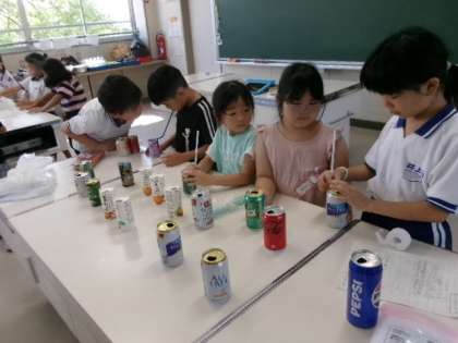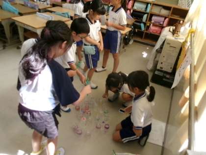 2年生が1年生を教室と家庭科室に招いて、おもちゃまつりをしていました。