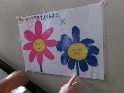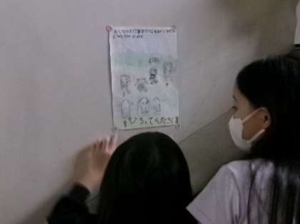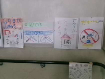 廊下や階段に、夏休みに描いたポスターも貼りました。