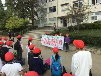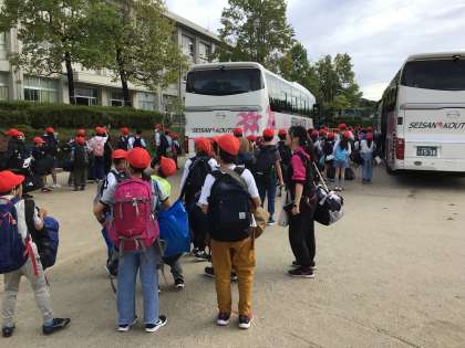 8時45分ごろ、5年生が六所山にある豊田市総合野外センターへ、バス2台に乗って出かけました。