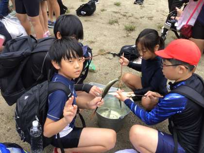 とった鮎を一人一本ずつ串打ちして塩焼きにします。
