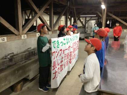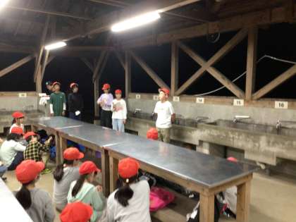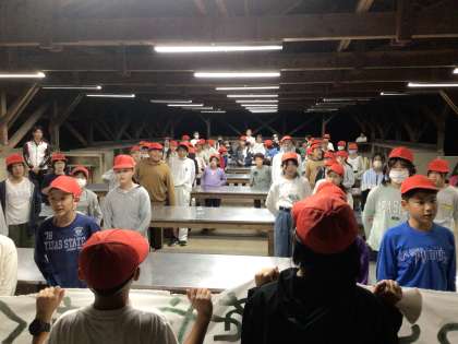 炊事場で夕べの集いをしました。天気が心配ですが、次はいよいよ、キャンプファイアーです!