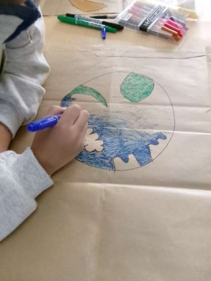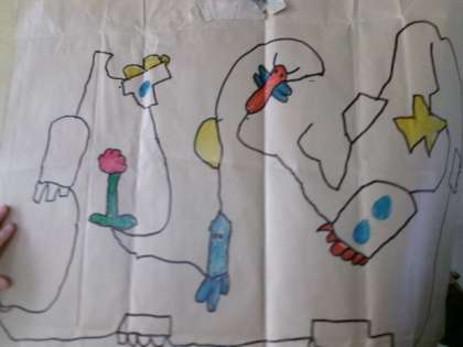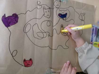 1年生が、茶色いコピー用紙の包み紙を使った図工「せんのぼうけん」の授業をしていました。味のある作品ばかりです。