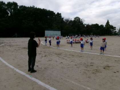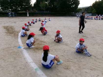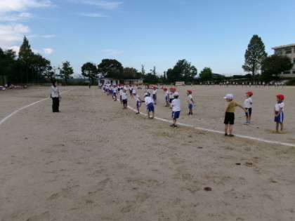 運動場で1・2年生が、運動会の合同練習をしていました。