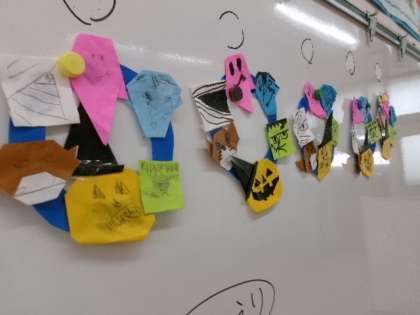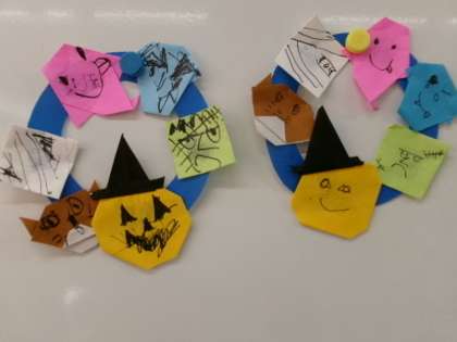 78組がハロウィンリースを作っていました。カラフルできれいですね。