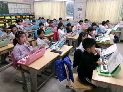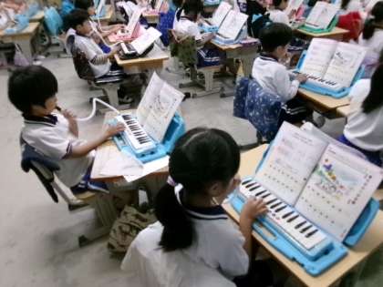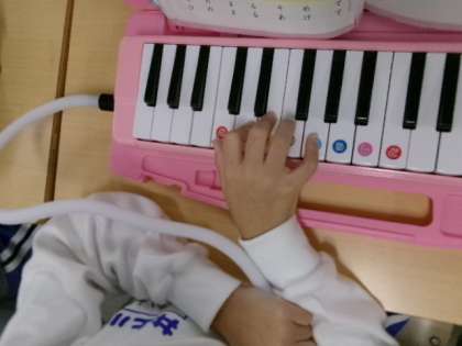 1年生が鍵盤ハーモニカを演奏していました。指の位置を確認してね。