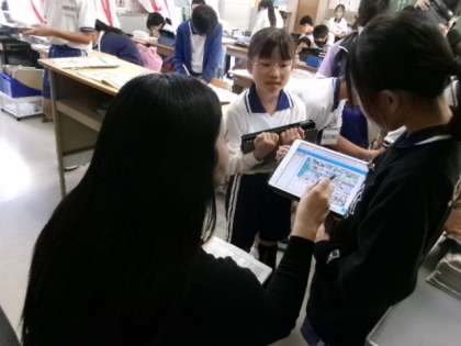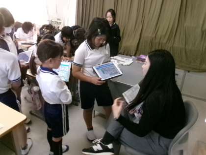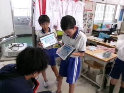 5年生の外国語「Let’s go to the zoo.」です。ALTの先生や学年の先生に聞かれた道順を英語でしゃべって伝えています。実際に使えるといいですね。