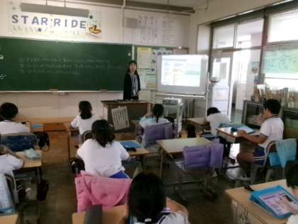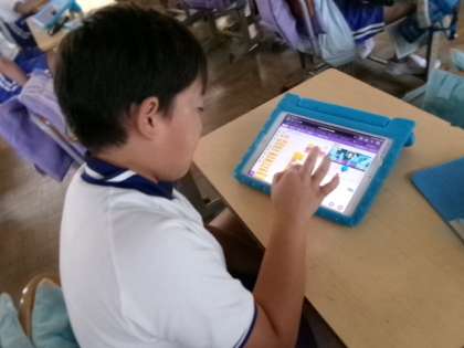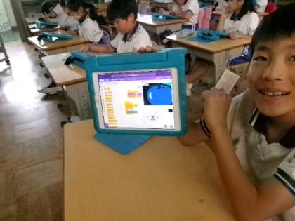 4年生プログラミングの授業です。タブレットで楽しいゲームを作っていました。すごいですね。