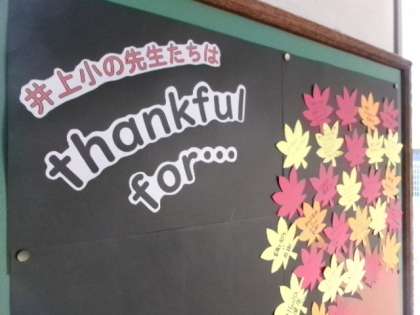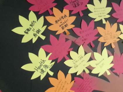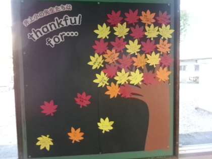 図工室前廊下のALTが作った掲示です。健康に家族に、皆さんに感謝!