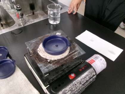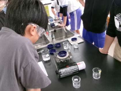 6年生「水溶液の見分け方を考えよう」です。安全のため、みんなしっかりとゴーグルをしていますね。