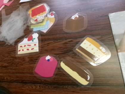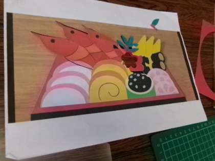 クリスマスケーキやおせちの掲示を作成中です。完成がとても楽しみです。
